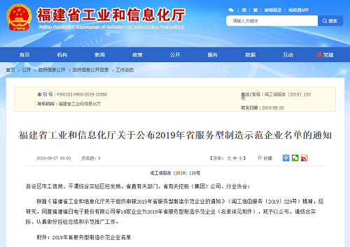 2019年8月26日,福建省工业和信息化厅公布了2019年省服务型制造示范企业名单,福建乐鱼网页版登录入口股份有限公司入选该名单。