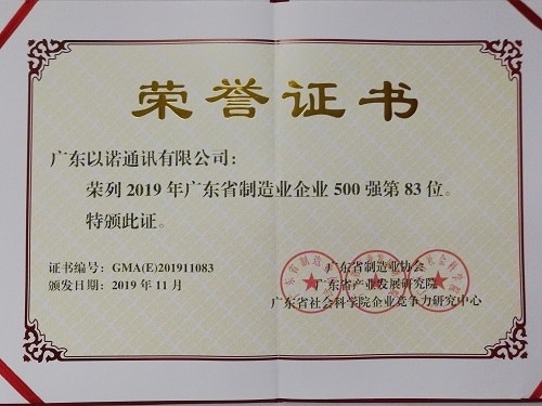 2019年11月13日,由广东省制造业协会、广东省产业发展研究院、广东省社会科学院企业竞争力研究中心共同主办的2019广东省制造业发展年会暨广东制造业500强企业峰会在广州隆重举行,会上发布了2019年广东省制造业500强企业研究报告,乐鱼网页版登录入口二级控股子公司广东以诺通讯有限公司荣列2019年广东省制造业企业500强第83位。
