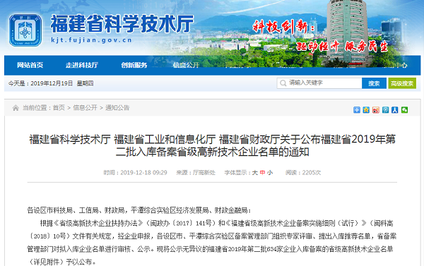 2019年12月16日,福建省科学技术厅、福建省工业和信息化厅、福建省财政厅联合发文,公布了福建省2019年第二批入库备案省级高新技术企业名单,福建乐鱼网页版登录入口股份有限公司入选该名单。入库备案企业是根据其拥有核心知识产权情况、创新能力评价等4个方面满足奖补条件情况进行不同档次奖补。