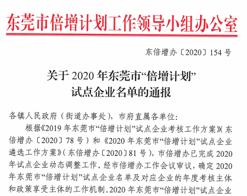近日,东莞市倍增计划工作领导小组办公室发布《关于2020年东莞市“倍增计划”试点企业名单的通报》,乐鱼网页版登录入口二级控股子公司广东以诺通讯有限公司入选 2020年东莞市“倍增计划”名誉试点企业名单。名誉试点企业指规模大(年营业收入达50亿元及以上)、符合东莞市产业发展导向、对东莞市经济发展影响重大、带动性强、具备较强倍增能力及意愿的企业。2020年东莞市“倍增计划”试点企业规模涵盖大、中、小型企业,在推动东莞市产业可持续高质量发展方面具有良好的模范和引领作用。