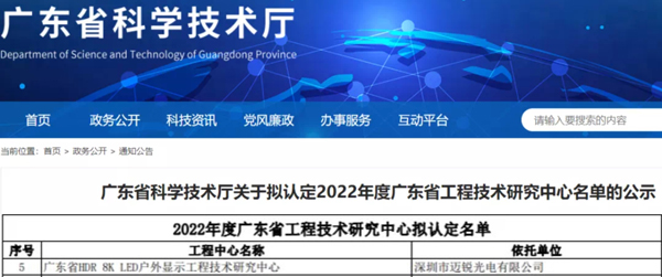 近日,广东省科学技术厅发布了《关于拟认定2022年度广东省工程技术研究中心名单的公示》,经专家评审和网上公示,乐鱼网页版登录入口成员企业迈锐光电获2022年度广东省HDR 8K LED户外显示工程技术研究中心资格认定。